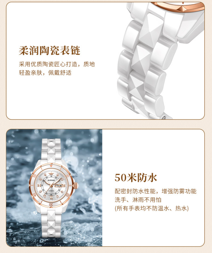 七、手表防水的,切记只防冷水,不防温水,不防热水,不防蒸汽,因为手表的防水胶圈受温度影响会热胀冷缩出现水雾。或在温度变化很大的环境中使用,使的表内空气中的水分凝结,从而引起进水和表内出现水雾凝结任何防水表都不宜戴着洗热水浴、桑拿浴或在温度变化很大的环境中使用。因为防水胶圈受温度影响会热胀冷缩出现空隙并加速老化从而引起进水和表内出现水凝结物,严重的将使机件损坏。腕表的防水依靠表镜、后盖、把头等处的防水胶圈而达到相应的标准。所有防水表均在底盖上打有“WATERRESISTANT"或“WATERPROOF"的英文字样。无防水标记手表仅能防尘,应避免沾水,30米(3ATM,即3个大气压)防水表,可用日常梳洗或雨中使用,即水滴只溅在表面上而未有任何水压加于表上。50米防水表可适用于游泳及一般家务,100米防水表可用于游泳和潜水等水下工作。