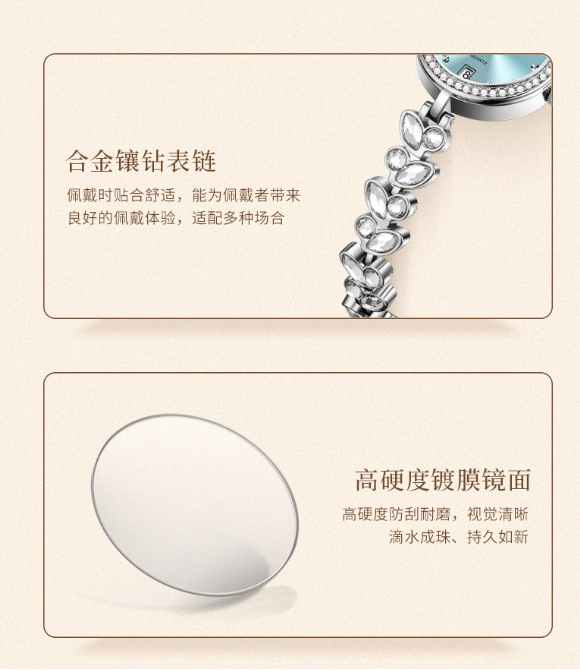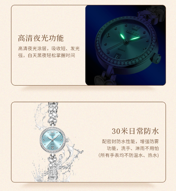 七、手表防水的,切记只防冷水,不防温水,不防热水,不防蒸汽,因为手表的防水胶圈受温度影响会热胀冷缩出现水雾。或在温度变化很大的环境中使用,使的表内空气中的水分凝结,从而引起进水和表内出现水雾凝结任何防水表都不宜戴着洗热水浴、桑拿浴或在温度变化很大的环境中使用。因为防水胶圈受温度影响会热胀冷缩出现空隙并加速老化从而引起进水和表内出现水凝结物,严重的将使机件损坏。腕表的防水依靠表镜、后盖、把头等处的防水胶圈而达到相应的标准。所有防水表均在底盖上打有“WATERRESISTANT"或“WATERPROOF"的英文字样。无防水标记手表仅能防尘,应避免沾水,30米(3ATM,即3个大气压)防水表,可用日常梳洗或雨中使用,即水滴只溅在表面上而未有任何水压加于表上。50米防水表可适用于游泳及一般家务,100米防水表可用于游泳和潜水等水下工作。